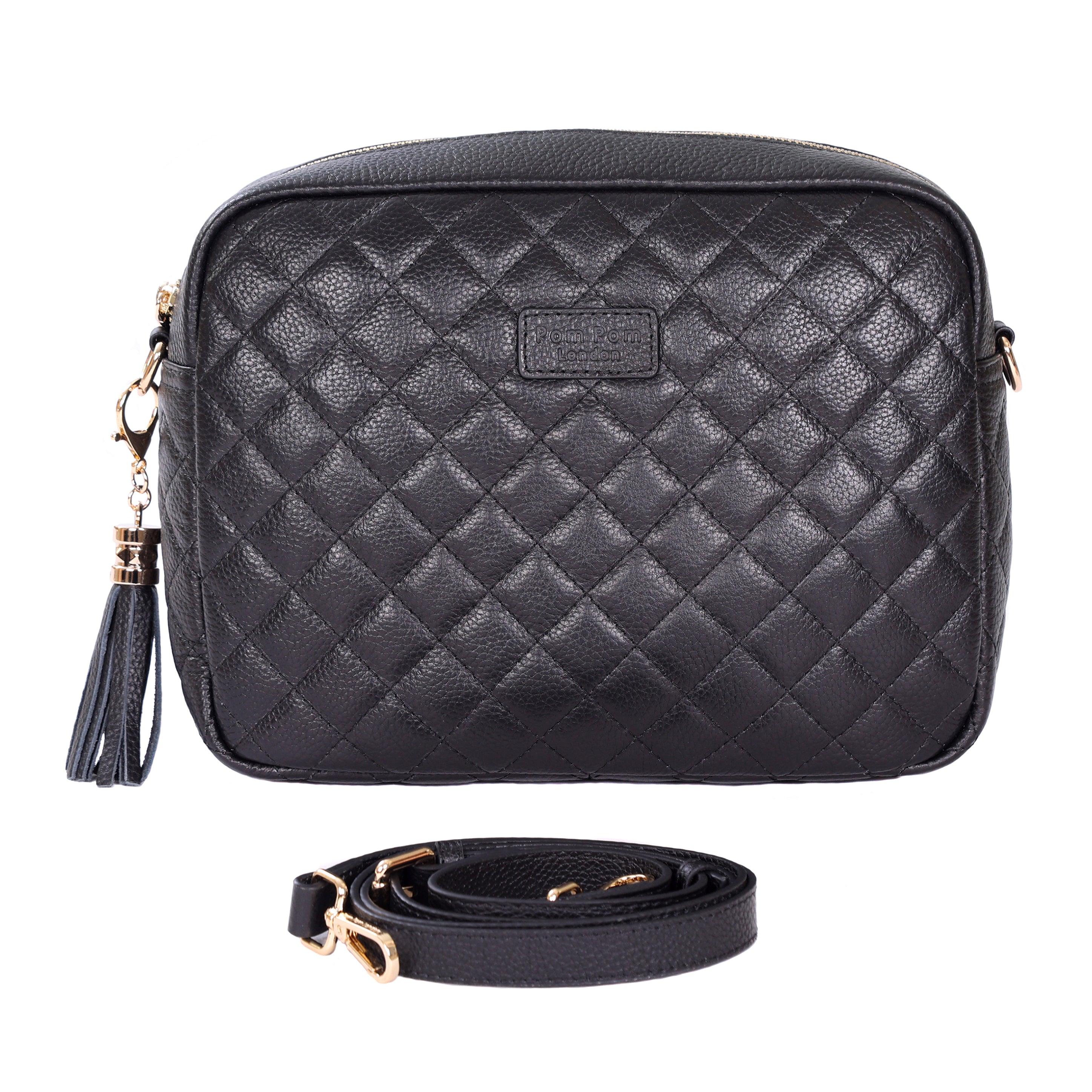 - Pom Pom London Quilted City Plus Bag in Black - A stylish crossbody crafted in quilted full grain leather.